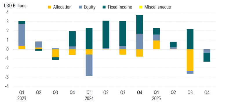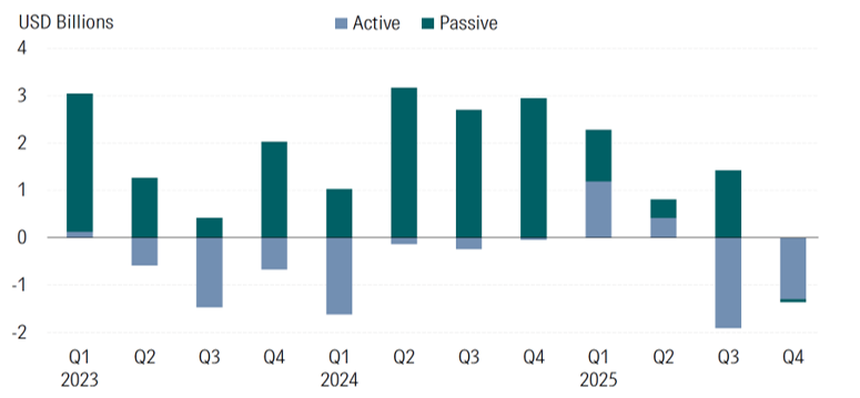 Source: Morningstar Direct. Data as of December 2025. China is not included in Q4 flows due to data unavailability.