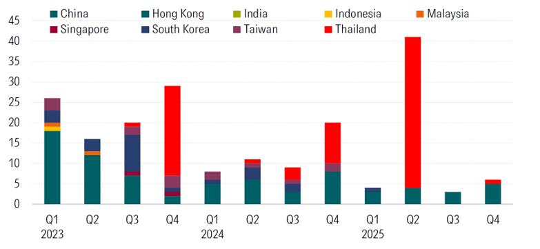 For full-year 2025, 54 new funds were launched in Asia ex-Japan, slightly above 2024 but well below peak volume in 2021-2023, when annual launches averaged nearly 100. 2025 launch activity was concentrated in Thailand (38) and China (15), with one launch in South Korea.